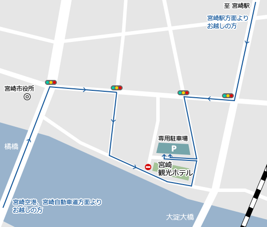 宮崎空港バス乗り場(宮崎交通)より橘通り1丁目下車、約30分(料金380円)